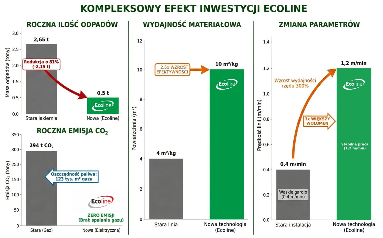 Imponujące wnioski płyną również z analizy zużycia materiału lakierniczego, gdzie porównanie efektywności starego i nowego procesu ujawnia technologiczną przepaść, którą udało nam się zasypać. Poprzednia linia pozwalała na pokrycie zaledwie 4 metrów kwadratowych powierzchni z jednego kilograma farby, co generowało ogromne straty finansowe. Zastosowanie przez Ecoline zaawansowanego systemu aplikacji oraz kabiny z precyzyjnym odzyskiem proszku pozwoliło uzyskać wydajność na poziomie 10 metrów kwadratowych z kilograma farby. Oznacza to aż 2,5-krotny wzrost efektywności materiałowej, co ma bezpośredni wpływ na znaczną redukcję kosztów, pozwalając na wykonanie tej samej pracy przy zużyciu o ponad połowę mniejszej ilości surowca.